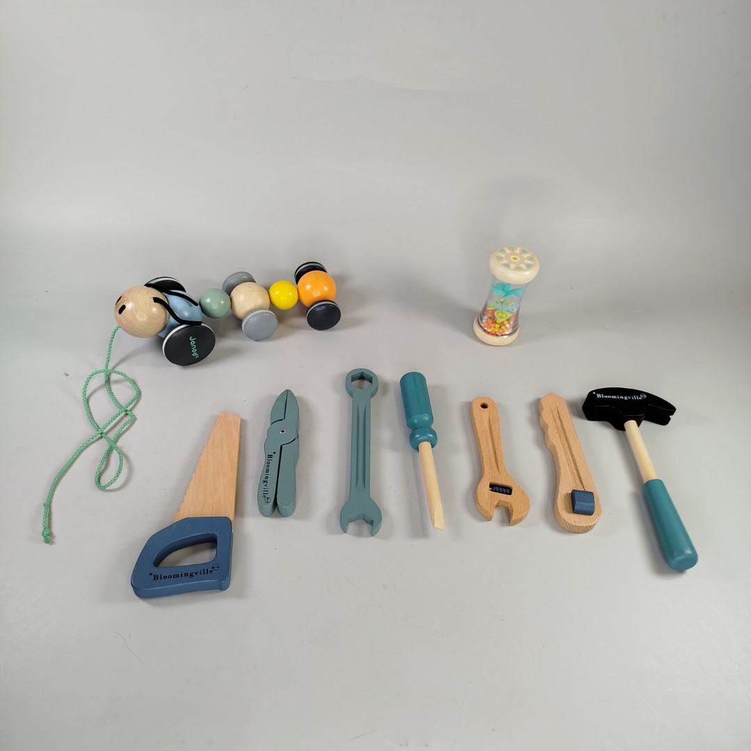 Dieses hochwertige Holzspielzeug-Set bietet vielseitigen Spielspaß für kleine Entdecker. Die Nachziehraupe von Janod fördert die Motorik und macht jede Bewegung zum Abenteuer. Die Holzrassel von Djeco begeistert mit bunten Perlen und angenehmen Klängen. Das Holz-Werkzeugset von Bloomingville enthält eine Säge, einen Schraubenzieher, eine Zange, einen Hammer und Schraubenschlüssel – ideal für kleine Handwerker:innen, die spielerisch ihre Geschicklichkeit trainieren möchten. Ein wunderbares Set für kreatives Spielen und die Förderung der Feinmotorik! Sicherheitshinweis: Nicht für Kinder unter 3 Jahren geeignet, wegen verschluckbarer Kleinteile.