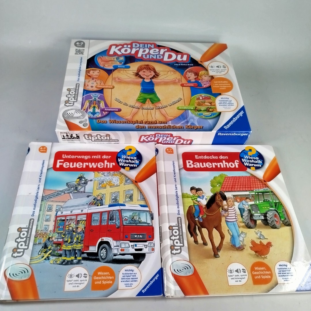 Dieses interaktive Tiptoi-Set von Ravensburger bietet drei spannende Lernabenteuer für Kinder. Dein Körper und Du vermittelt spielerisch Wissen über den menschlichen Körper. Unterwegs mit der Feuerwehr zeigt die aufregende Arbeit der Feuerwehr mit Geräuschen und Geschichten. Entdecke den Bauernhof nimmt Kinder mit in die Welt der Tiere und Landwirtschaft. Der Tiptoi-Stift ist nicht enthalten und wird für die interaktiven Funktionen benötigt.