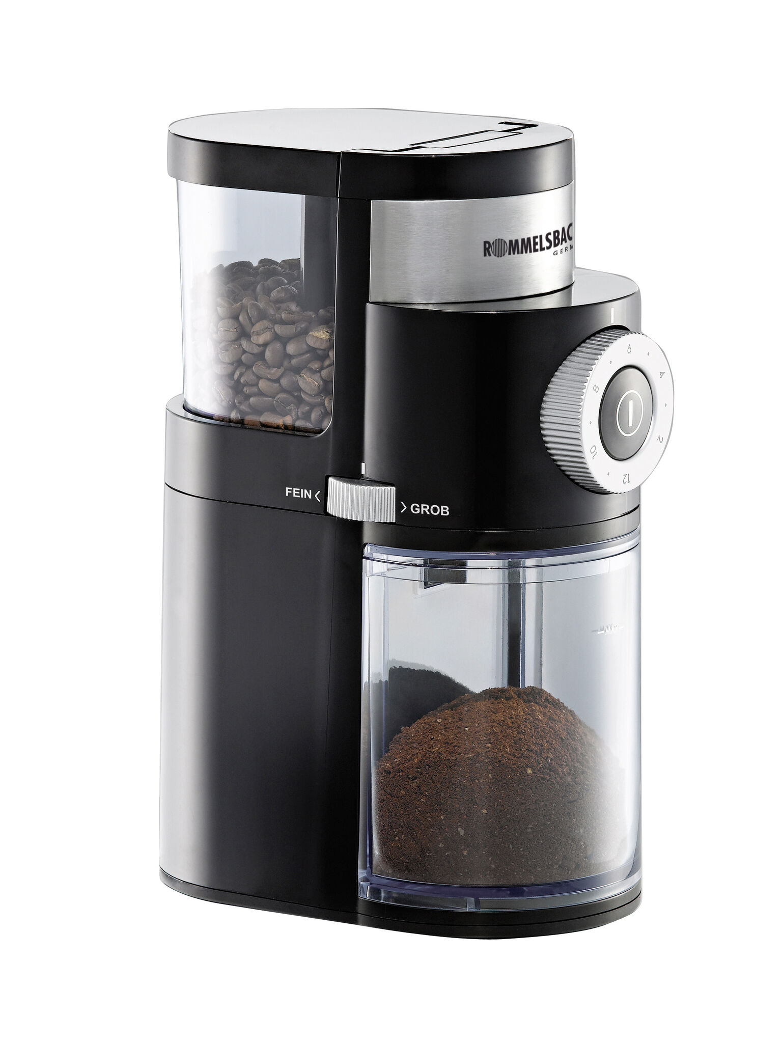 Die hochwertige refurbed Rommelsbacher Kaffeemühle EKM 200 mit formschönem Hochglanz-Kunststoffgehäuse und dekorativer Edelstahl-Applikation ist ein Blickfang in jeder Küche.