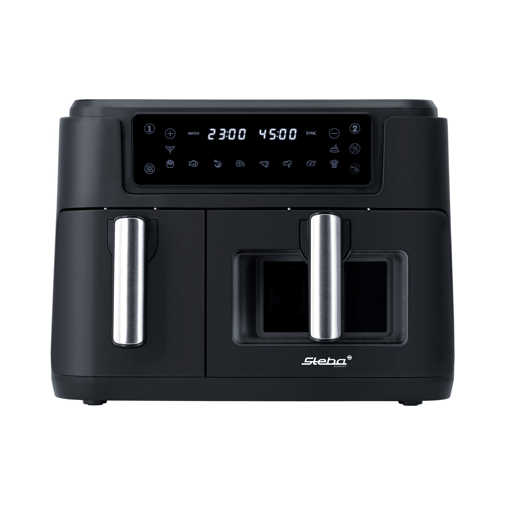Mit dem refurbed Steba HF 9500 DUO Airfryer werden Pommes & Co. im Handumdrehen zum gesunden Fast-Food – außen knusprig, innen zart! Das Beste dabei: Die Heißluft-Fritteuse ist ein kompakter Allrounder, der gleich mehrere Funktionen in einem vereint. Egal ob frittieren, kochen, backen oder grillen – mit der HF 9500 DUO können sogar Pizza und Brathähnchen, aber auch Brötchen und Kuchen zubereitet werden! Zwei PFAS-freie antihaftbeschichtete Frittier-Behälter bieten genügend Platz (insgesamt 9,5 l) für große Portionen für die ganze Familie. Wer kleinere Portionen zubereiten möchte, kann aber auch einfach nur den kleineren Behälter mit 3,5 Liter nutzen.