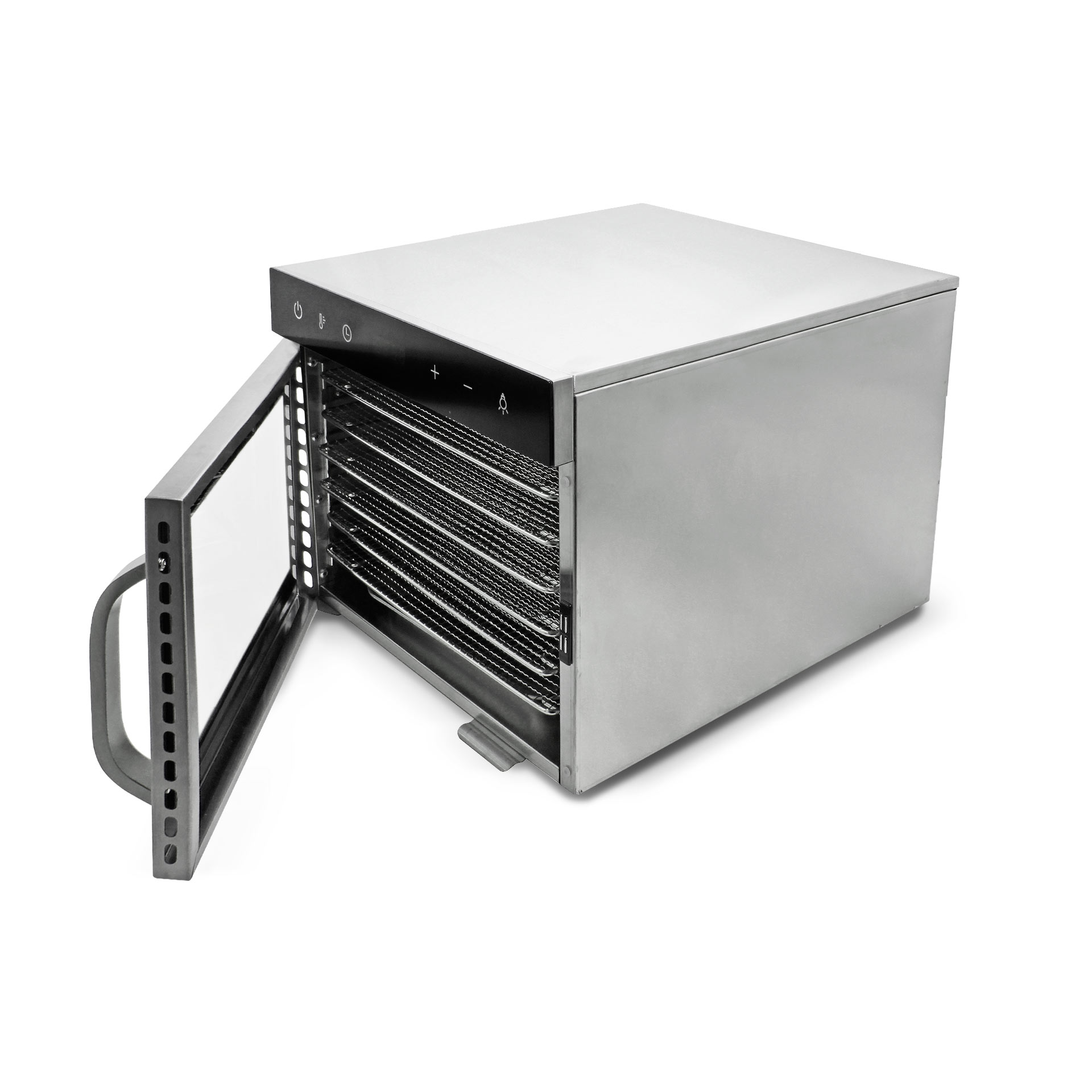 Über das Touch-Bedienfeld an der Front des Geräts stellst du mühelos die gewünschte Trocknungstemperatur von 25 bis 90 Grad Celsius sowie die Trocknungszeit von 30 Minuten bis 72 Stunden ein. Dank der praktischen Bedienfläche kannst du das Gerät auch auf halbhohen Schränken platzieren und dennoch komfortabel bedienen. Mit der Echtglastür und der LED-Innenbeleuchtung hast du dein Dörrgut jederzeit im Blick und kannst so die Trocknung genau überwachen.