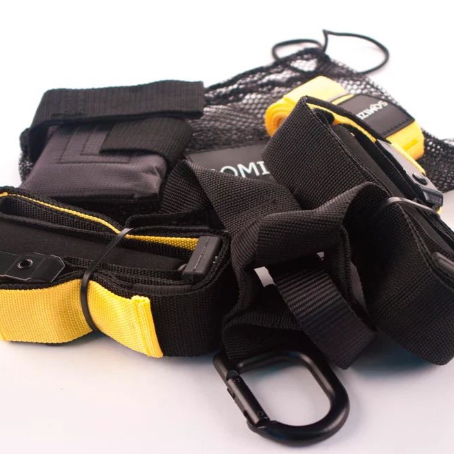 Dieser Profi Sling Trainer besteht aus superstabilem Industrienylon mit einem Belastungswiderstand bis 560 kg. Besonders belastete Stellen des Gurtesystem sind doppellagig. Die Karabinerhaken aus hochfestem Stahl weisen einen Durchmesser von 9 mm und massive Metall-Schnellverschlüsse. Die Kunststoffgriffe sind rutschsicher. Die Fußschlaufe ist mit einer Schutzpolsterung versehen. Die Einhängeschlaufe und ein Türanker sind inklusive.