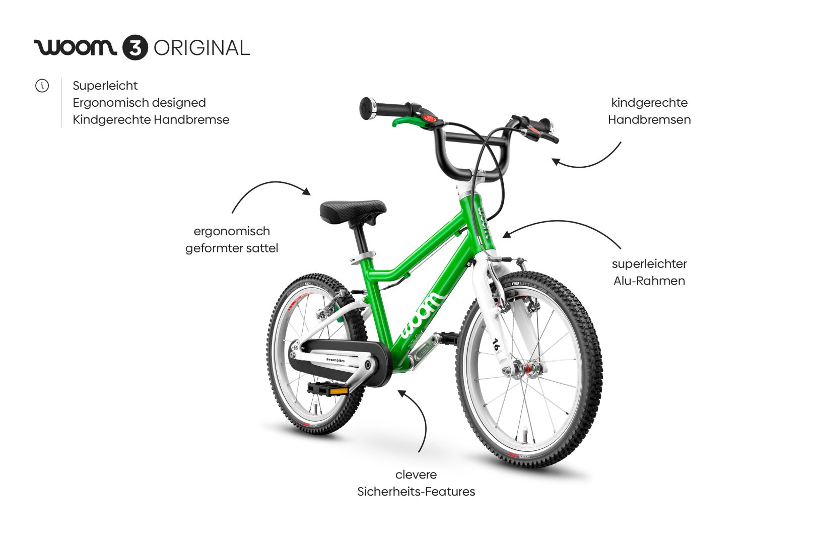 Eine aufrechte Sitzhaltung, das geringe Gewicht von 5,4 kg sowie der innvovative Rahmen sorgen für einen unbeschwerten Fahrspaß. Das große Plus - das woom ORIGINAL 3 ist ein wahres Leichtgewicht unter den Kinderfahrrädern und damit der beste Begleiter für erste längere Ausfahrten. Der spezielle Bremshebel kann gut von kleinen Kindernhänden mit geringer Handkraft bedient werden. So macht Radfahren Spaß!