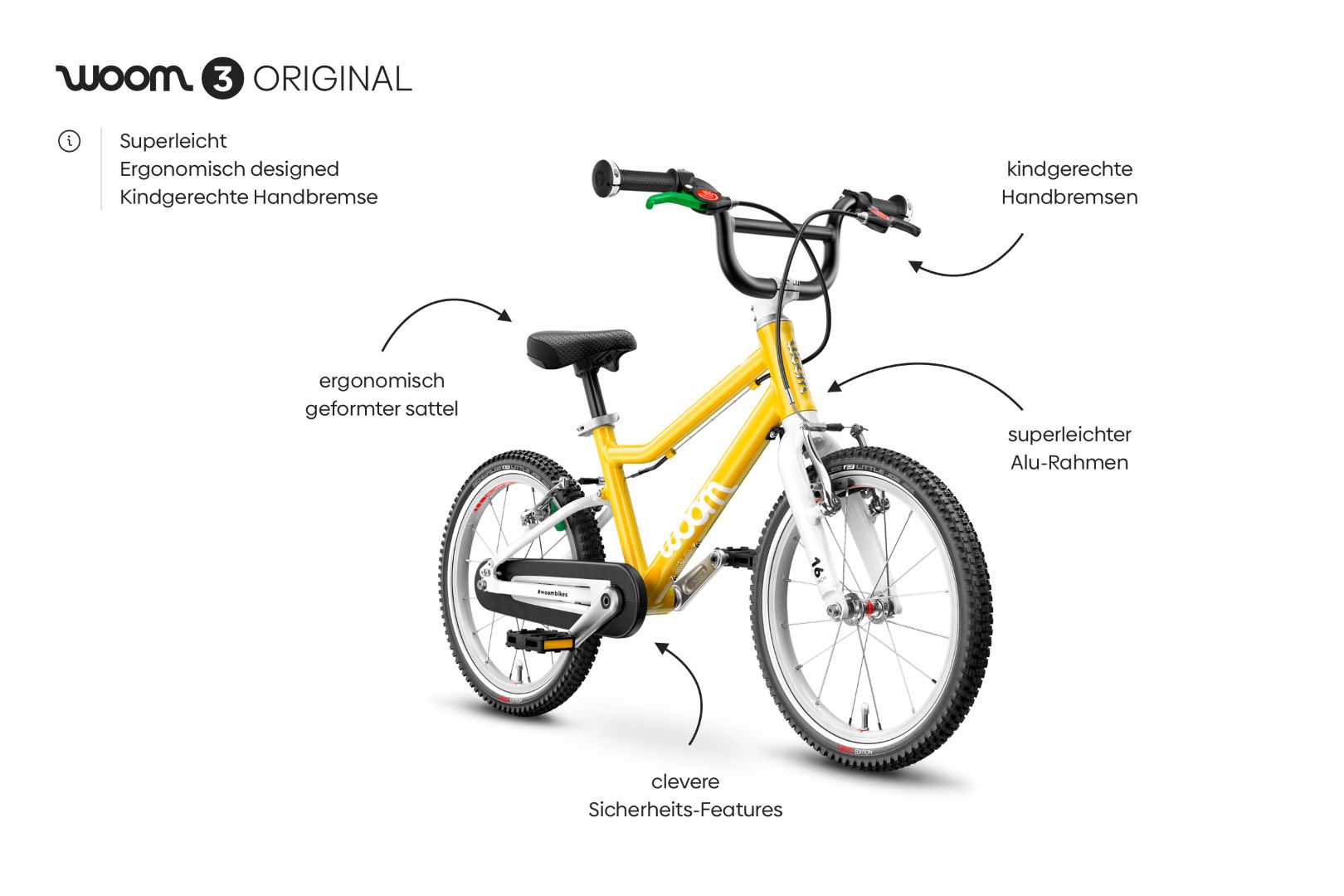 Eine aufrechte Sitzhaltung, das geringe Gewicht von 5,4 kg sowie der innvovative Rahmen sorgen für einen unbeschwerten Fahrspaß. Das große Plus - das woom ORIGINAL 3 ist ein wahres Leichtgewicht unter den Kinderfahrrädern und damit der beste Begleiter für erste längere Ausfahrten. Der spezielle Bremshebel kann gut von kleinen Kindernhänden mit geringer Handkraft bedient werden. So macht Radfahren Spaß!